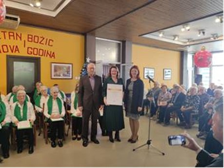 Certifikat je, kao rezultat zajedničkog predanog rada svih zaposlenika uz suradnju stanara i rodbine uručen ravnateljici Doma na božićnoj svečanosti 21.12.2023. od strane predstavnika QSocial gospođe Mateje Hauser i gospodina Franza Imperla i u pristustvu zamjenika Župana PGŽ gospodina Petra Mamule, resorne pročelnice gospođe Dragice Marač i bivše ravnateljice gospođe Marije Maras.